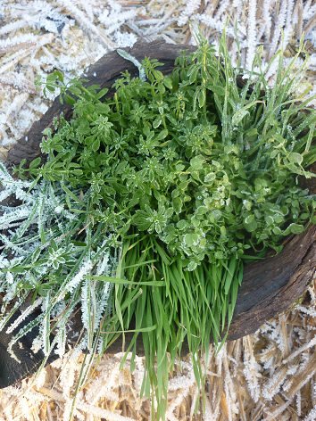 Da jetzt im Januar die gefrorenen, noch lebenden Pflanzen auch zur Mittagszeit oft nicht auftauen, schneide ich sie gefroren ab, um sie für Smoothies, Grünes Wasser oder Frischpress-Saft zu nutzen. Allerdings kann ich sie dann nicht aufbewahren, sondern muss sie sofort verwenden. Doch da ich dreimal täglich meine Sammelrunde gehe, ist das kein Problem. Fast jeden Tag steigt aber gegen Mittag die Temperatur und alles taut ab – die Pflanzen stehen wieder frisch und knackig da, als wären sie nie gefroren gewesen. Wie so etwas funktioniert? Die winterfesten Pflanzen haben sozusagen ein Frostschutzmittel in ihren Zellen, nämlich Salze. Dadurch können sie ihren Gefrierpunkt heruntersetzen. Auf dem Foto seht Ihr gefrorenes Labkraut, Gras und Vogelmiere.