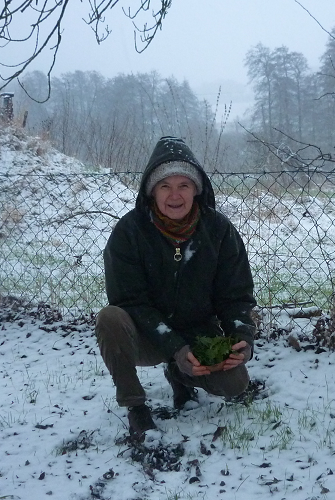 Wenn ich so im eiskalten Wind hocke und der Schneeregen geradezu waagerecht an mir vorbeifliegt, denke ich oft daran, dass die Tiere nicht so wie ich gleich wieder in ein gemütliches Haus mit bullerndem Ofen heimkehren können und schon bin ich wieder froh, beides zu haben: Mitten im Winter frisches, leuchtendes Grün sammeln zu können und gleichzeitig einen mollig-warmen Platz zu haben, an dem ich meine Schätze in inniger Verbundenheit ganz gemütlich verzehren kann.